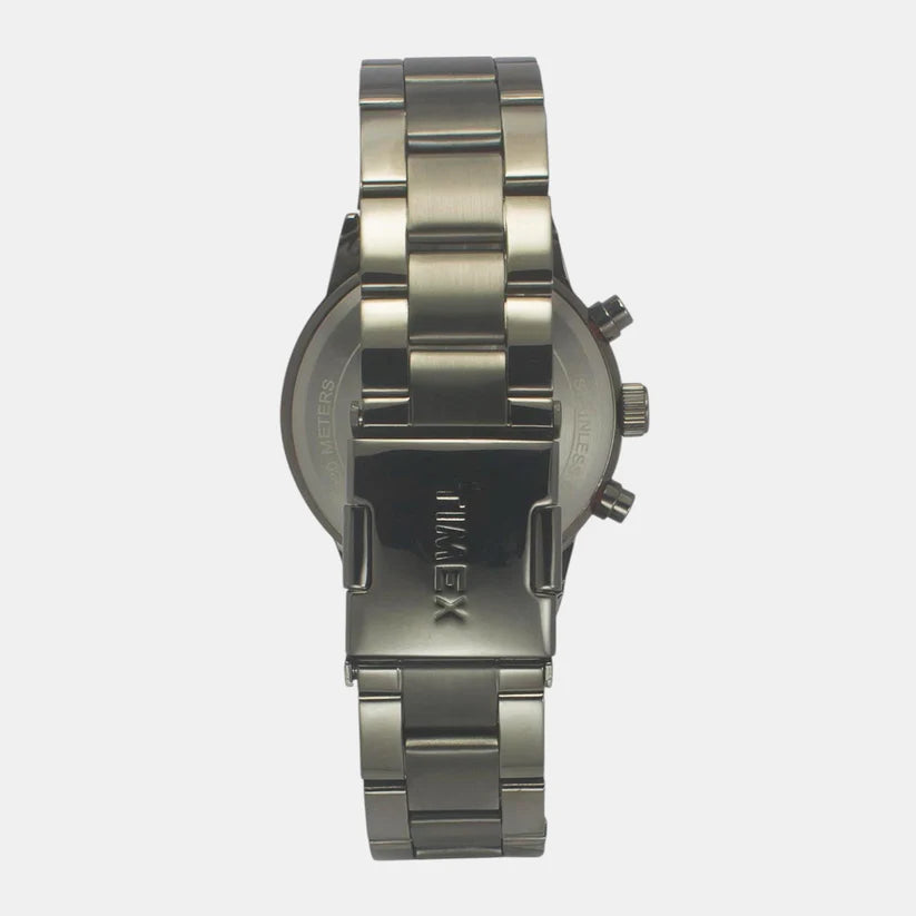 The gunmetal / grey stainless steel bracelet adds contrast and gives a rugged / modern feel.